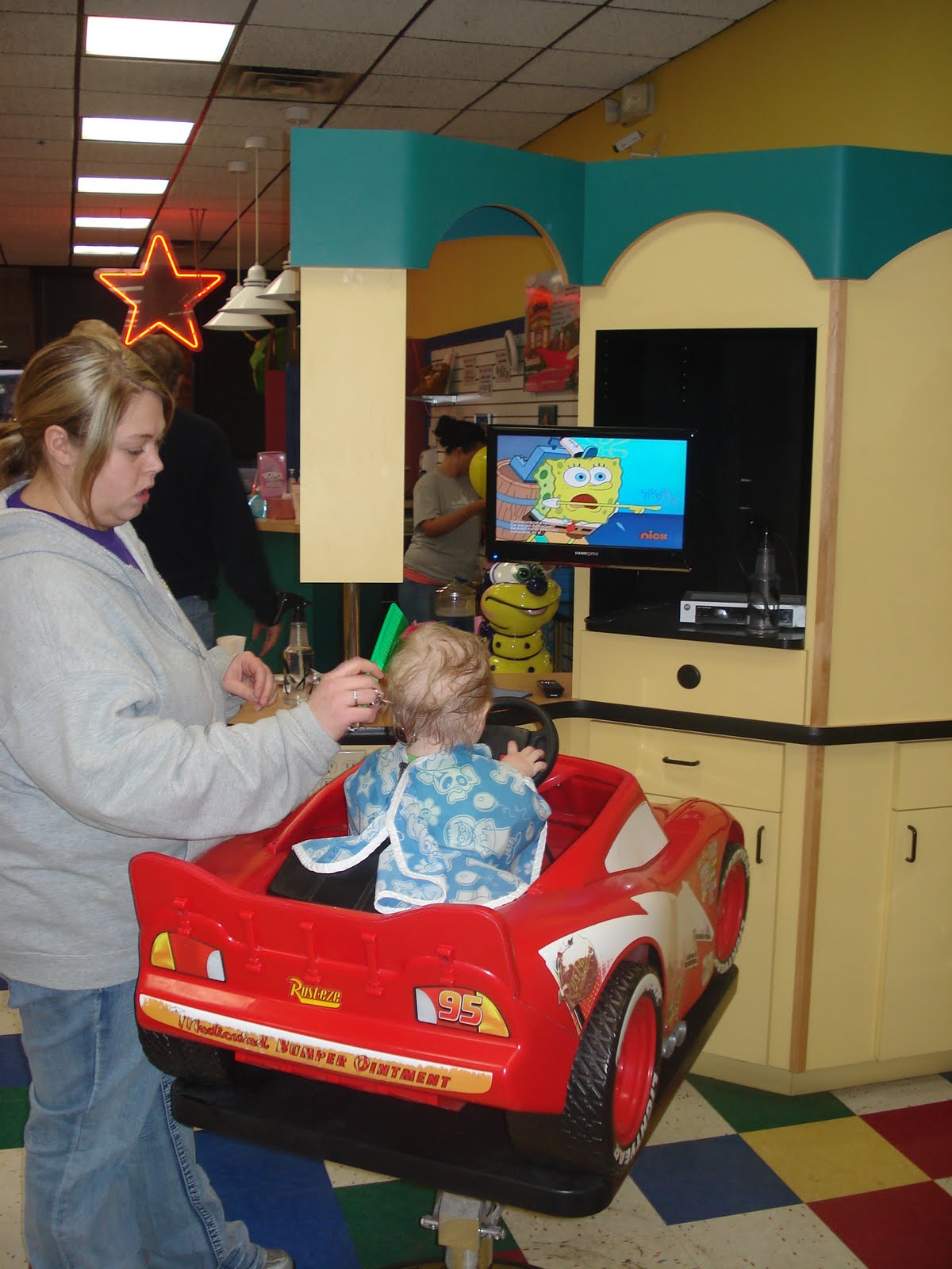 The chair that was used for him to sit in was a car, so he could sit in the car and move the steering wheels around and honk the horn. There was also a small tv in front of him so he could watch cartoons while she cut his hair. The tv didn't really spark his interest, maybe because he never watches SpongeBob and doesn't know what it is. Now if NickJr or PBSKids were on, then he probably would have been glued to the tv.